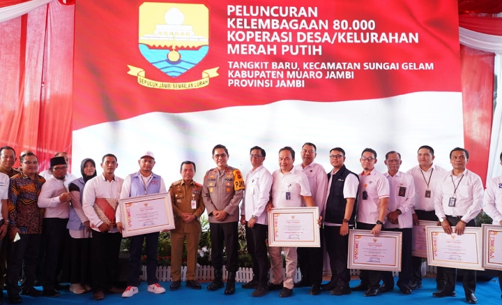 JAMBI – Presiden Republik Indonesia Prabowo Subianto meresmikan Peluncuran Kelembagaan Koperasi 80.000 Desa/Kelurahan Merah Putih (KDMP) Se-Indonesia. Peluncuran Koperasi Desa/Kelurahan Merah Putih yang dirangkai dengan Hari Koperasi Nasional Ke-78 Tahun 2025 ini dipusatkan di Desa Bentangan, Kecamatan Wonosari, Kabupaten Klaten, Provinsi Jawa Tengah, Senin (21/07/2025). Sementara itu untuk Provinsi Jambi launching Koperasi Desa/Kelurahan Merah Putih serentak secara virtual dipusatkan di Kantor Koperasi Desa Merah Putih Tangkit Baru, Kecamatan Sungai Gelam, Kabupaten Muaro Jambi.