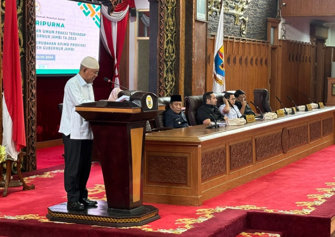JAMBI – DPRD Provinsi Jambi, Sabtu (30/3) menggelar rapat paripurna dengan agenda penyampaian pandangan umum fraksi terhadap nota pengantar Laporan Keterangan Pertangungjawaban (LKPj) Gubernur Jambi tahun anggaran 2023 dan Penyampaian Ranperda Perubahan RPJMD Provinsi Jambi tahun 2021-2026 yang sebelumnya disampaikan Gubernur Jambi.