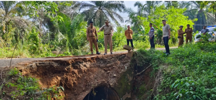 Salah satu fokus utama peninjauan adalah jalan 23 di Desa Rimbo Mulyo, Kecamatan Rimbo Bujang, yang kondisinya hampir terputus akibat longsor.