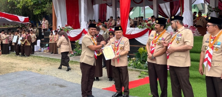 TEBO – Ketua Kwartir Cabang Gerakan Pramuka Tebo dan juga sebagai sebagai bakal calon wakil bupati Nazar Efendi, SE. terima Penghargaan Lencana karya bakti yang diserahkan lansung oleh gubernur Jambi Al Haris, dihadiri langsung Ketua Kwartir Nasional Gerakan Pramuka Kakak Dr.H. Sigit Muryono., M.Pd. Kons. Acara tersebut dipusatkan di lapangan merdeka Kota Sungai Penuh, pada 7 September 2024.