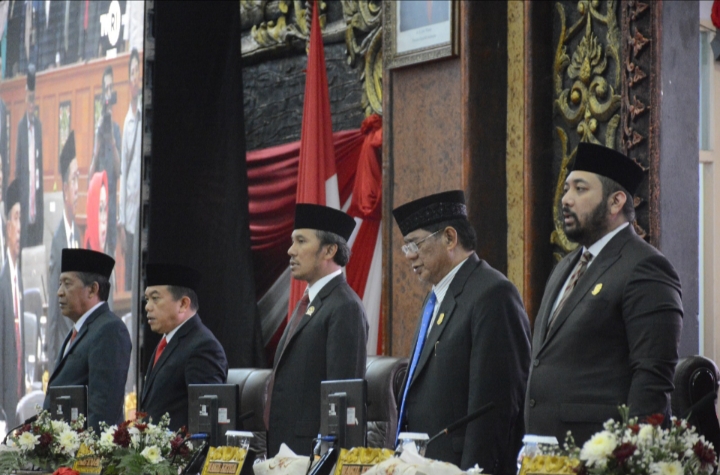 JAMBI – Ketua DPRD Provinsi Jambi, Edi Purwanto memimpin rapat paripurna DPRD Provinsi Jambi dalam rangka mengikuti pidato kenegaraan presiden republik indonesia dalam rangka HUT ke 78 Kemerdekaan Republik Indonesia, Rabu (16/8).