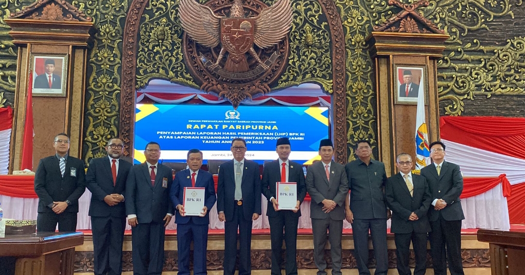 Dihadiri anggota V BPK RI Ahmadi Noor Supit, didampingi oleh Kepala Perwakilan BPK Perwakilan Provinsi Jambi, Paula Henry Simatupang menyerahkan LHP atas LKPD Provinsi Jambi Tahun Anggaran 2023 kepada Ketua DPRD Provinsi Jambi, Edi Purwanto dan Gubernur Jambi Al Haris.