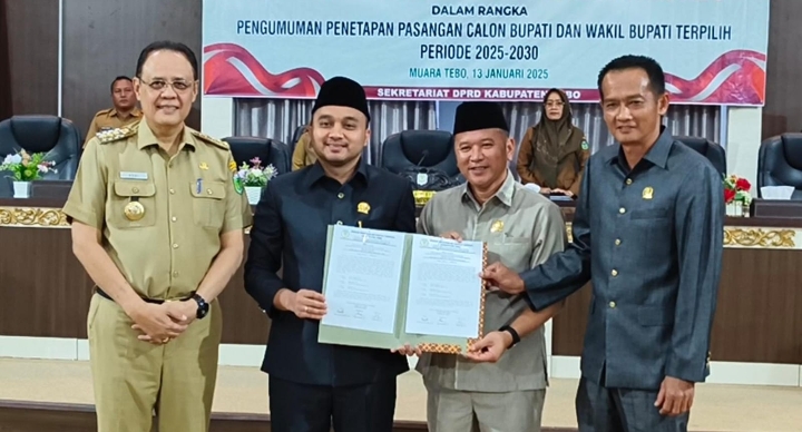 TEBO – Dewan Perwakilan Rakyat Daerah (DPRD) Kabupaten Tebo mengumumkan Agus Rubianto SE. MM. dan Nazar Efendi, SE., M.Si sebagai Bupati dan Wakil Bupati Tebo terpilih periode 2025-2030.