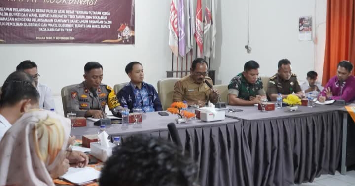 TEBO – Kaban Kesbangpol Tebo beserta OPD terkait dan bersama unsur Forkompinda Tebo menghadiri rapat pelaksanaan debat publik atau debat terbuka Putaran kedua calon bupati dan wakil bupati kabupaten Tebo tahun 2024 di aula KPUD Tebo, Senin 11 November 2024.(***)