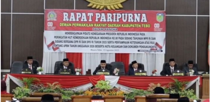 TEBO – Ketua DPRD Tebo, Khalis Mustiko (KM) pimpin rapat paripurna (Rapurna) dalam rangka mendengarkan pidato ke negaraan Presiden RI pada peringatan HUT RI kemerdekaan indonesia ke 80 pada sidang tahunan MPR-RI, DPR-RI, DPD-RI tahun 2025 serta penyampaian keterangan atas RUU tentang APBN tahun anggaran 2026 beserta nota pengantar keuangan dan dokumen pendukungnya, Jum’at 15 Agustus 2025.