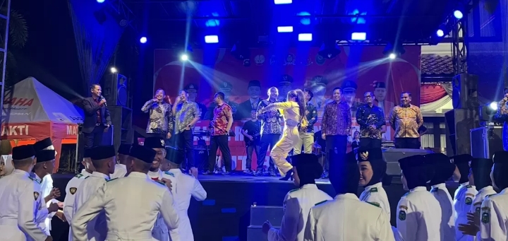 TEBO – Dimeriahkan artis jebolan dangdut pantura Indosiar, Agis Pletok. Resepsi kenegaraan peringati Hari Ulang Tahun (HUT) Republik Indonesia (RI) Ke-80 Pemkab Tebo Meriah.