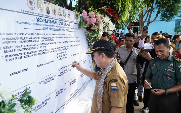 JAMBI – Gubernur Jambi Dr. H. Al Haris, S.Sos, MH bersama Forum Koordinasi Pimpinan Daerah (Forkopimda) Provinsi Jambi menandatangani komitmen bersama pelaksanaan Sistem Penerimaan Murid Baru (SPMB) yang berintegritas untuk tahun ajaran 2025/2026. Penandatanganan komitmen bersama ini diselenggarakan di SMKN 1 Kota Jambi, Selasa (10/06/2025) pagi.