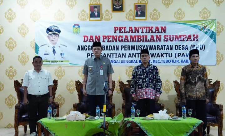 TEBO – Pj Bupati Tebo Varial Adhi Putra di dampingi oleh Ketua Penggerak PKK Kabupaten Tebo serta Kadis PMD dan Kadis Perpustakaan melantik anggota BPD PAW Desa Sungai Bengkal Barat Kecamatan Tebo Ilir, pada Jumat 30 Agustus 2024.(jnc)